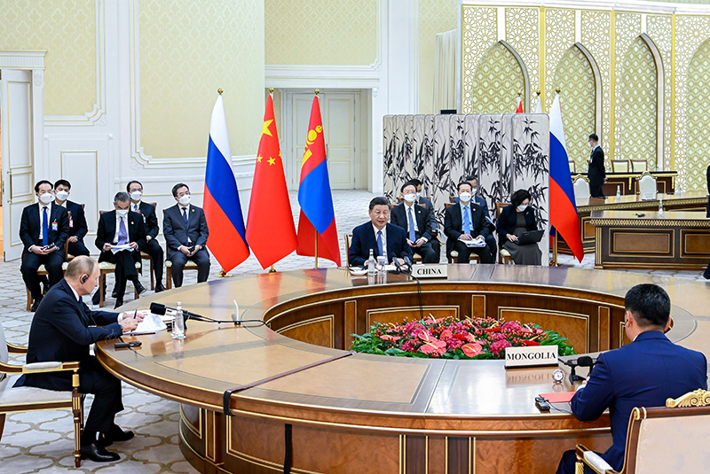 當(dāng)?shù)貢r間9月15日下午,國家主席習(xí)近平在撒馬爾罕國賓館同俄羅斯總統(tǒng)普京、蒙古國總統(tǒng)呼日勒蘇赫舉行中俄蒙三國元首第六次會晤。新華社記者 翟健嵐 攝